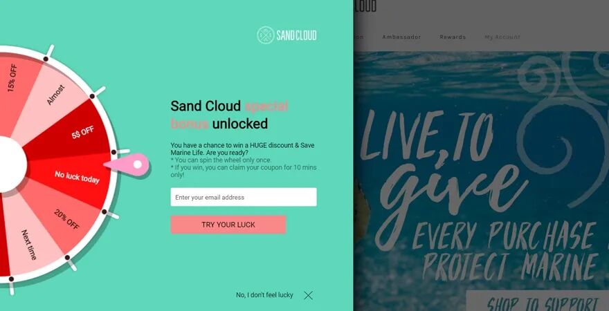 Sand Cloud 采用的是旋转轮游戏化策略,里面有20%、50% 的折扣券。用户参与会让他们有一种获胜的感觉,促使他们立即行动使用折扣。