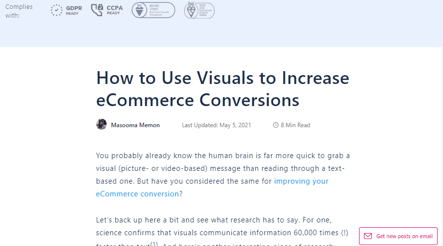 vwo 网站的博客文章页面有设计这类可隐藏式订阅表格。vwo 博客文章右下角有个粉色的小浮标「Get new posts on email」,只要轻轻点击它,订阅表格便会跳出来。