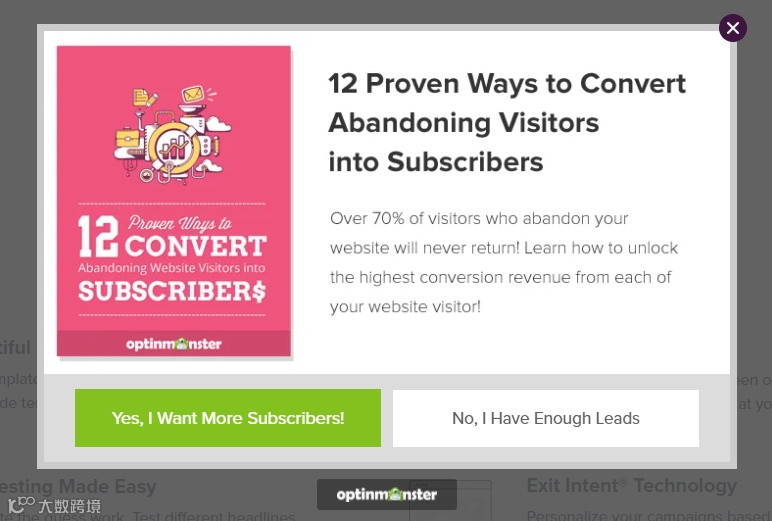选择性订阅表格表示订阅表格提供订阅用户多一个选择,理念上与退出意图弹出订阅表格相似,尊重访客意愿,目标相同:访客退出网页之前三思而行。对于大部分的订阅表格,访客不愿意订阅留下资料,想要关闭掉,点击表格的「X」图标即可关闭。但是你是否想过?订阅表格中使用清晰的关键元素「是」和「否」按钮,会更加吸引访客,甚至停留下来阅读窗口的详细内容呢?