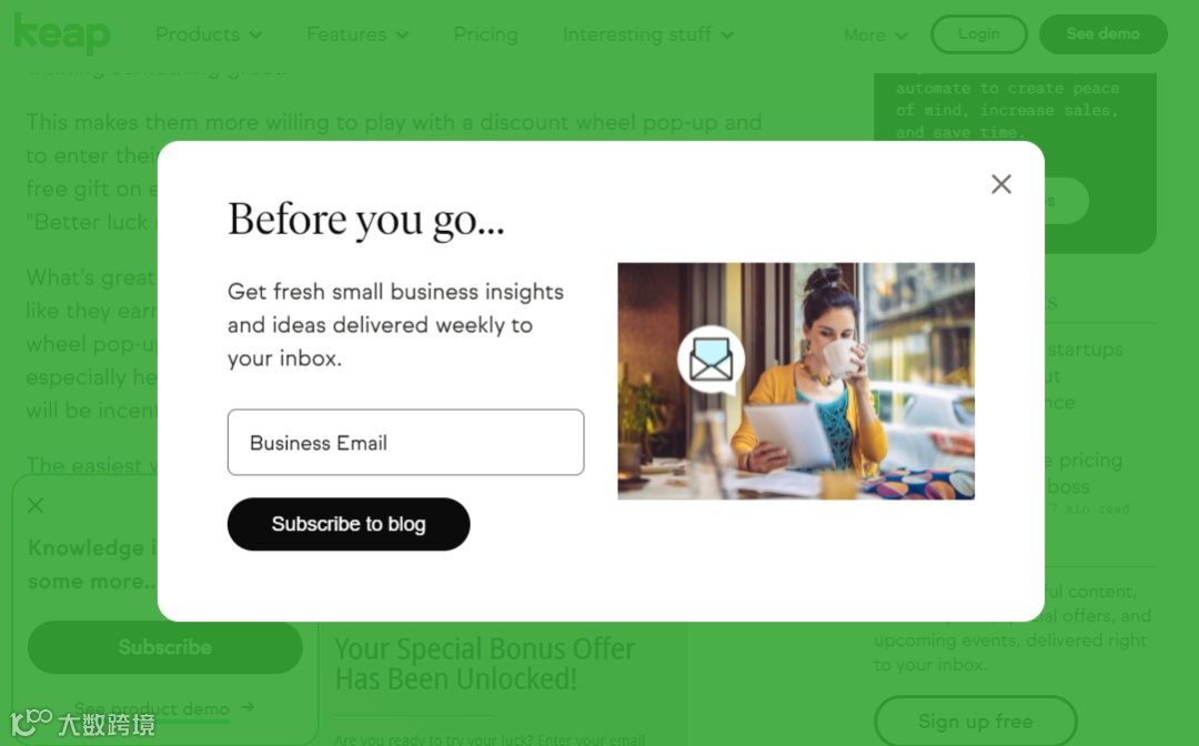 访客浏览完毕 keap 网站,准备离开的时候,网页会弹出订阅表格,提示访客离开网页之前进行订阅每周时报。