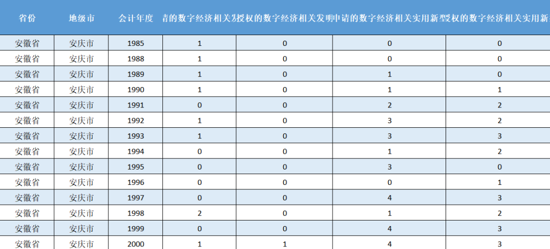 9.全国各省、地级市数字经济专利参考孙勇等(2022)的做法,参照《浙江省数字经济核心产业统计分类目录》,确定计算机通信和其他电子设备制造业、电子信息机电制造业、专用电子设备制造业、大型广播电视和卫星传输服务业、互联网及其相关服务业、软件和信息技术服务业、文化数字内容及其服务业等 7 大类 128 小类行业作为数字经济核心产业统计范围。进一步参照国家统计局发布的《国际专利分类与国民经济行业分类参照关系表(2018)》,对数字经济对应的国际专利分类号进行统计,得到全国各省份、地级市 1985-2022 年数字技术专利数据。
