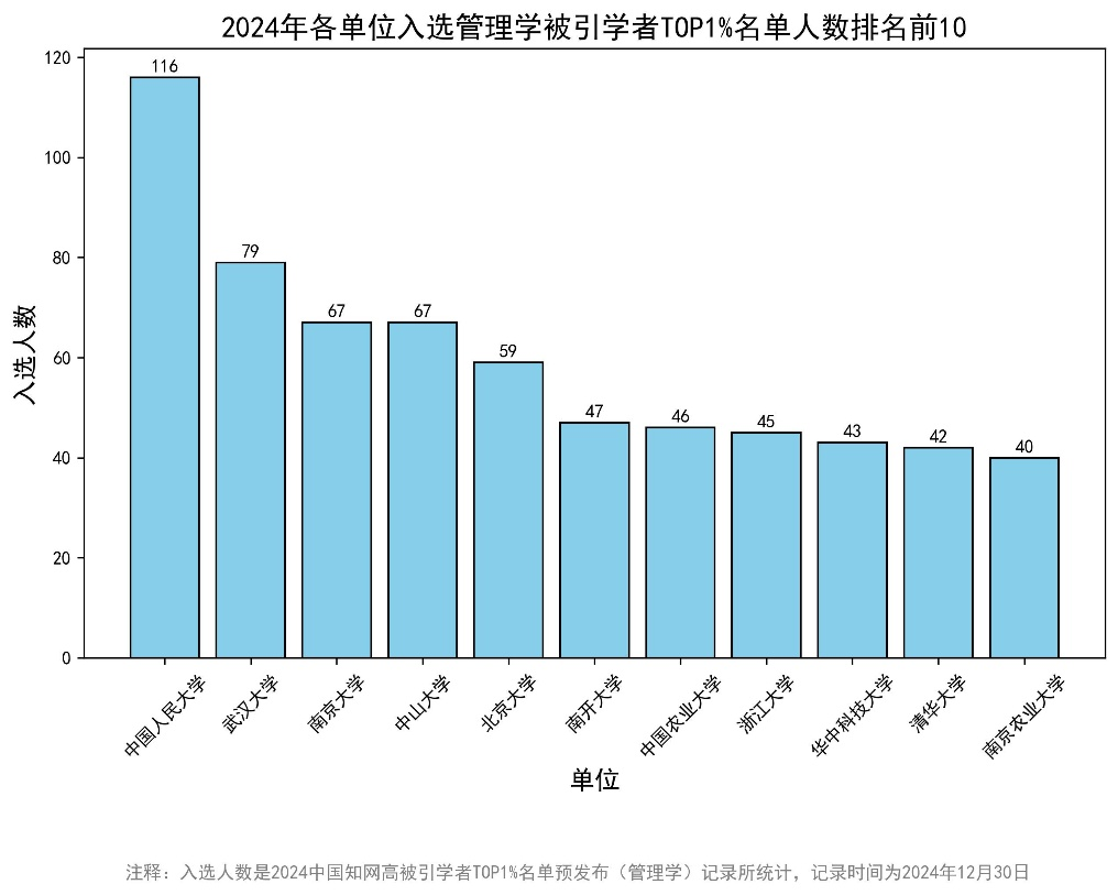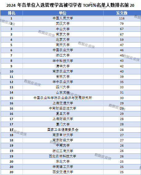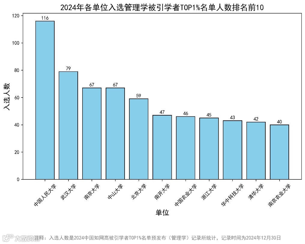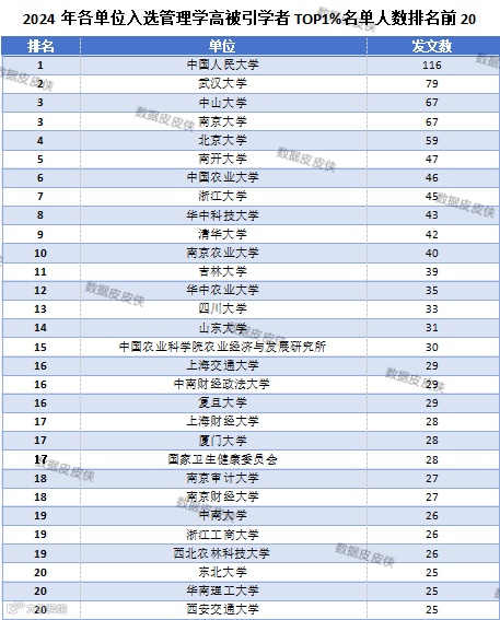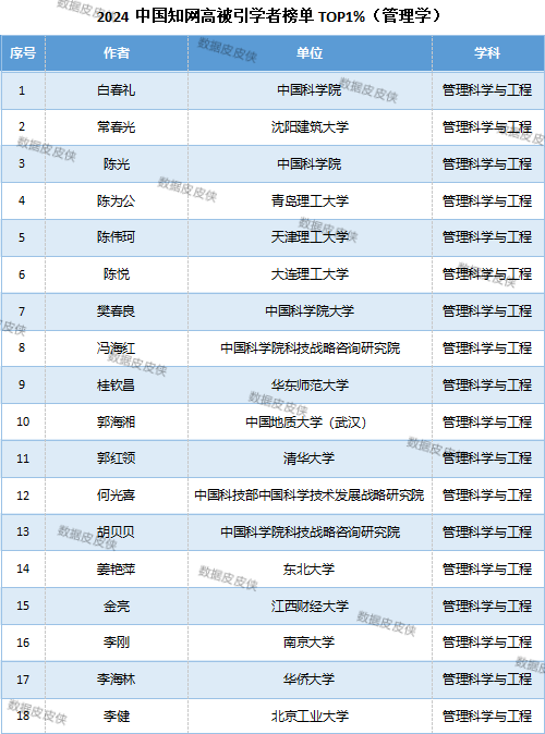 继2024中国知网高被引学者经济学名单预发布(重磅来袭!2024中国知网高被引学者TOP1%名单预发布(经济学)!),数据皮皮侠团队还根据知网评价中心数据,制作了管理学名单信息,并统计了“2024中国知网高管理学科领域高被引学者TOP1%名单预发布”中各院校机构单位所属学者数量。需要指出的是,本次排名并不代表真实的科研水平,仅供学术交流与参考。