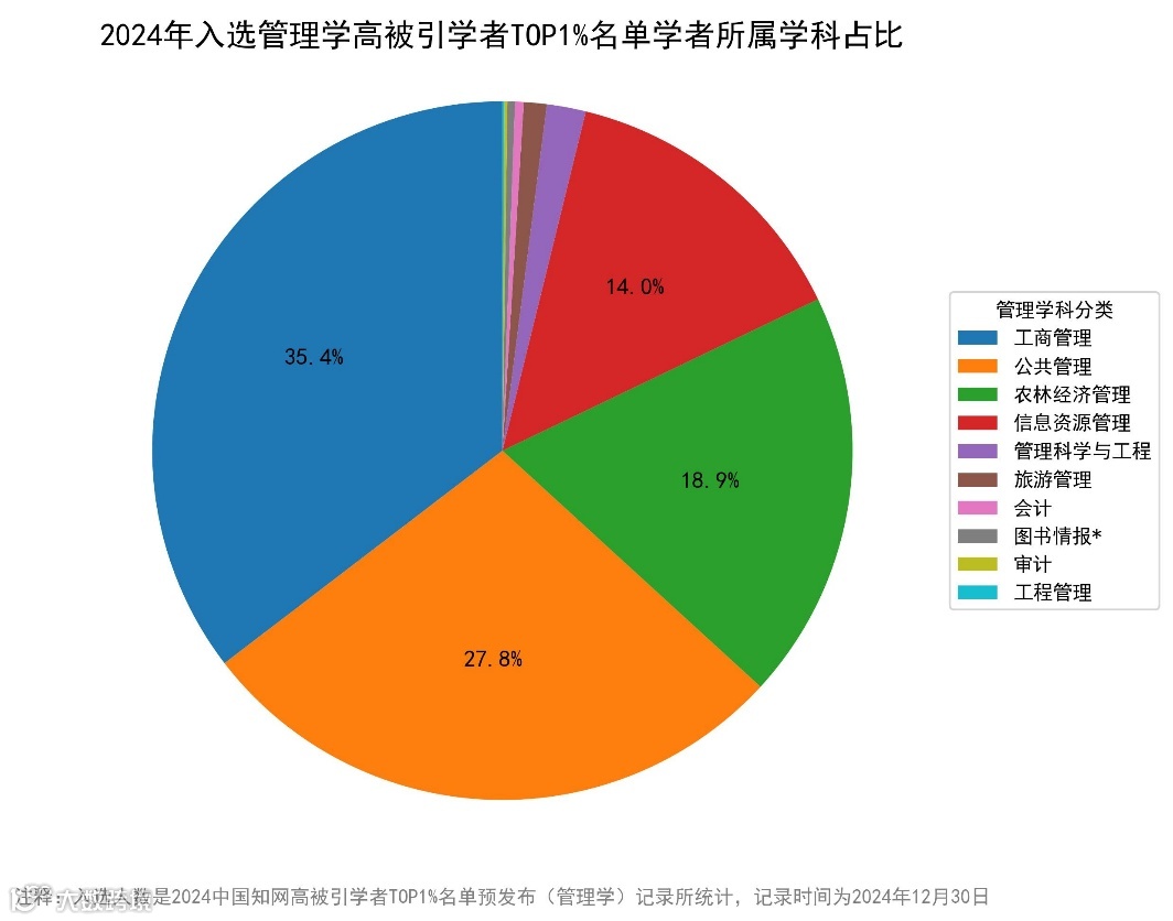 本文主要讨论管理学科方面的入选者TOP1%,根据平台分类,管理学学科主要分为管理科学与工程、工商管理、农林经济管理、公共管理、信息资源管理和旅游管理六个方向;另外,根据数据显示,在此次TOP1%预发布榜单当中管理学学科共有3499位学者入选,公布的名单按姓氏拼音首字母排序。