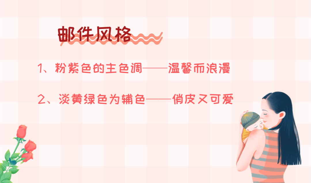 邮件内容的好坏是可以直接影响到转化率。母亲节主打的是情怀,那么您在设计的时候,可以把整封邮件基调可以走简洁而温馨的路线。可以以粉紫色为主色调,显得温馨浪漫,也可以加上淡绿色为辅,显得俏皮可爱。建议内容要简单干净,同时要富有吸引力,并且要与产品的风格统一。