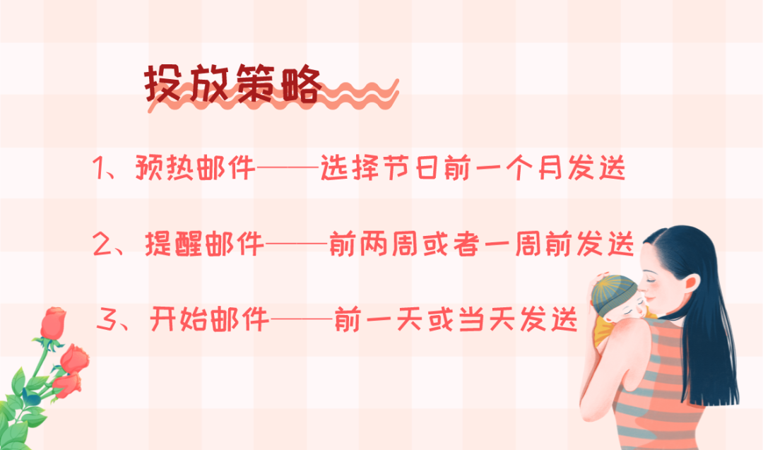 在做节日促销邮件营销时,我们建议至少投放两轮邮件。第一轮邮件作为预热邮件,时间可选择节日前一个月,既可错开节日邮件的投递高峰期,也可以领先一步获得客户的关注和流量。