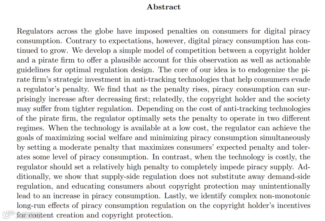 全球监管机构已对数字盗版消费的消费者进行处罚。然而,与预期相反,数字盗版消费持续增长。我们开发了一个版权所有者和盗版公司之间竞争的简单模型,为这一观察结果提供了合理的解释,并为最佳监管设计提供了可行的指导方针。我们的核心理念是将盗版公司对反跟踪技术的战略投资内生化,帮助消费者逃避监管机构的处罚。我们发现,随着惩罚的增加,盗版消费量在先降低后会出人意料地增加;与此相关,版权所有者和社会可能会受到更严格的监管。根据盗版公司的反跟踪技术成本,监管机构将处罚最佳地设置为在两种不同的制度下运作。当该技术以低成本获得时,监管机构可以通过设定适度的处罚来实现最大化社会福利和最小化盗版消费的目标,该处罚使消费者的预期处罚最大化并容忍一定程度的盗版消费。相反,当技术成本高昂时,监管机构应该设定相对较高的处罚,以完全阻止盗版供应。此外,我们表明,供给方监管并不能取代需求方监管,对消费者进行版权保护教育可能会无意中导致盗版消费增加。最后,我们确定了盗版消费监管对版权所有者对内容创作和版权保护的激励措施的复杂非单调的长期影响