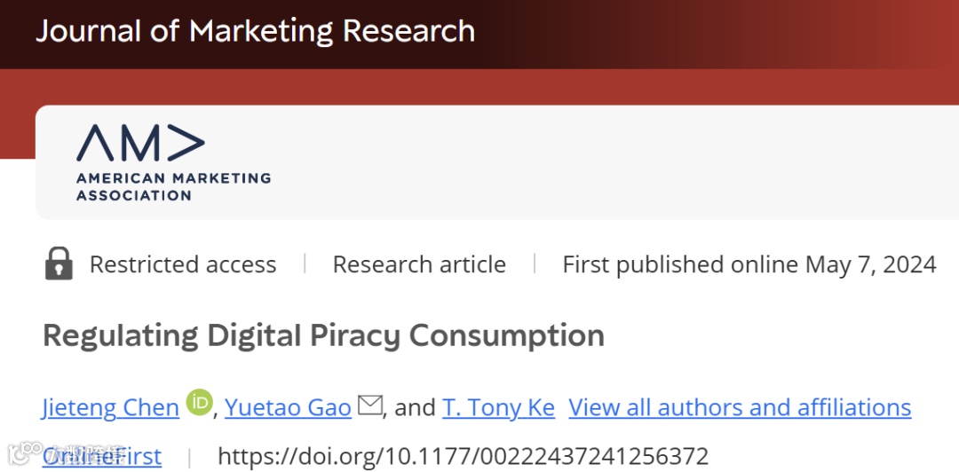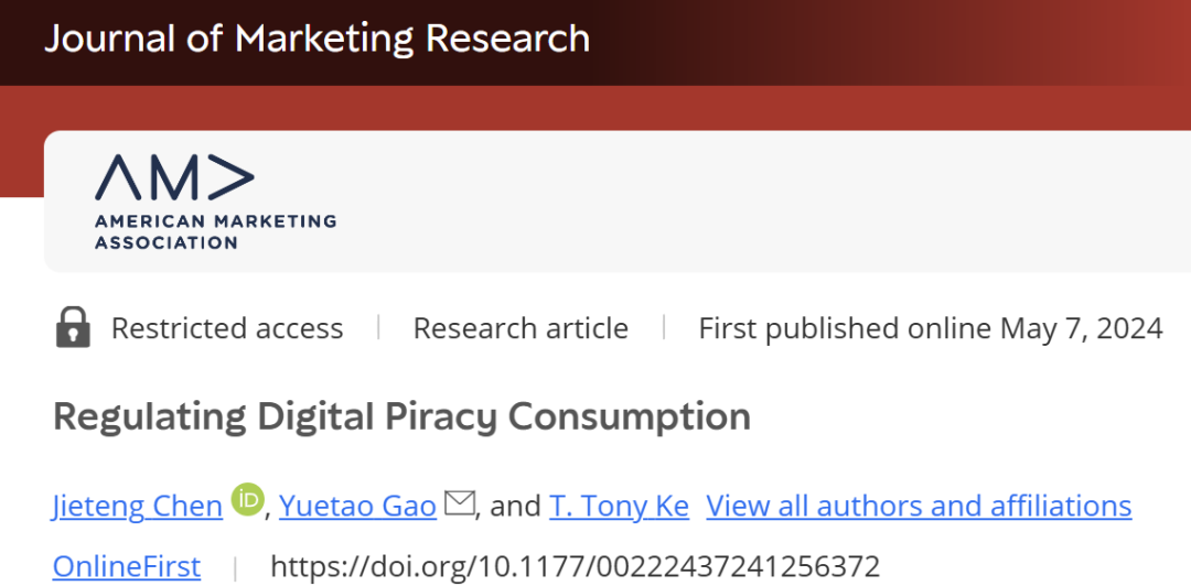 根据JMR官网显示,由香港中文大学Jieteng Chen博士、厦门大学管理学院市场学系高月涛副教授和香港中文大学T. Tony Ke教授合作的论文“Regulating Digital Piracy Consumption”发表于UTD-24市场营销学顶尖期刊《Journal of Marketing Research》!