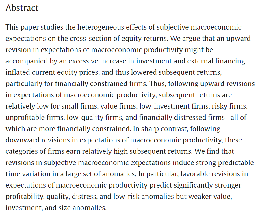 本文研究了主观宏观经济预期对横截面股票收益的异质性影响。我们认为,宏观经济生产率预期的向上修正可能会伴随着投资和外部融资的过度增加,从而推高当前的股票价格,并因此降低随后的收益,尤其是对于财务受限的企业而言。因此,在宏观经济生产率预期向上修正之后,小企业、价值型企业、低投资企业、高风险企业、无盈利企业、低质量企业和财务困境企业的后续收益相对较低——这些企业都面临更严重的财务约束。与此形成鲜明对比的是,在宏观经济生产率预期向下修正之后,这些类别的企业获得了相对较高的后续收益。我们发现,主观宏观经济预期的修正会在大量异常现象中引发强烈的可预测时间变化。特别是,宏观经济生产率预期的正面修正预示着更强的盈利能力、质量、困境和低风险异常现象,但价值、投资和规模异常现象会减弱。