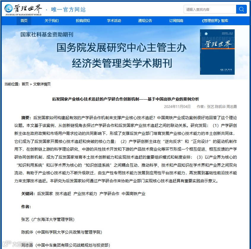 根据《管理世界》期刊官网显示,由广东海洋大学管理学院张艺教授、中国科学院大学公共政策与管理学院陈凯华教授与中国中车集团有限公司战略规划与投资部周志勇部长合作的论文 “后发国家产业核心技术追赶的产学研合作创新机制——基于中国高铁产业的案例分析“ 发表于中文顶级期刊《管理世界》!
