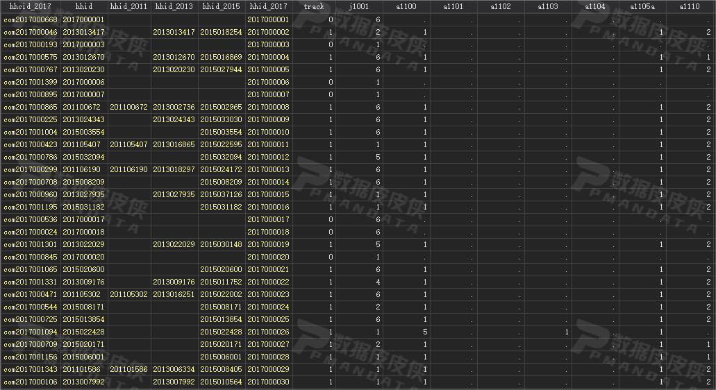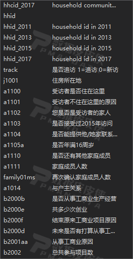 pline 是用于标识每个家庭成员的变量,每个pline代表一个家庭成员,通过结合hhid 和 pline 可唯一识别个体,同一家庭内各家庭成员在不同年度的pline保持不变。通过样本标识变量,三个数据集之间可以实现彼此的两两匹配。