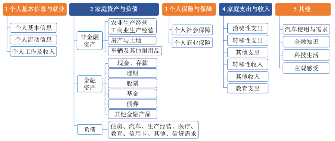 CHFS 调查问卷以家庭金融为主题,通过对受访户家庭的资产、负债、收入、消费等情况进行详细询问,旨在全面展示家庭金融现状,并描述中国家庭资产配置的相关问题。同时,通过持续追踪访问,记录中国家庭经济生活在宏观经济发展背景下的变化。在问卷设计过程中,CHFS 调查采用了模块化的方式,将问卷整体结构分为多个模块,每个模块对应不同的调查内容,如下图所示。