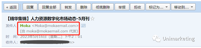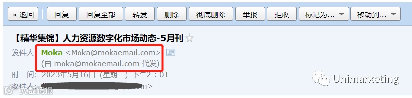 显示的是,<Moka@mokaemail.com>(由 moka@mokaemail.com 代发)。