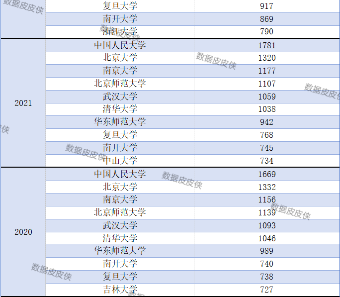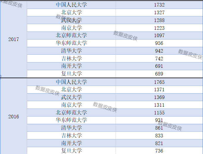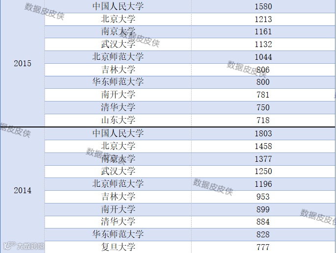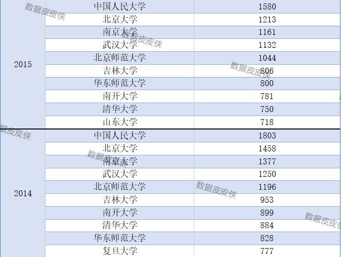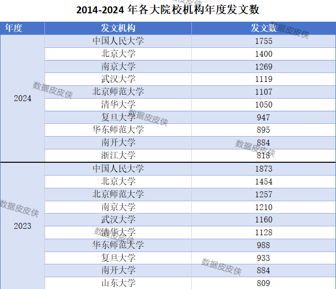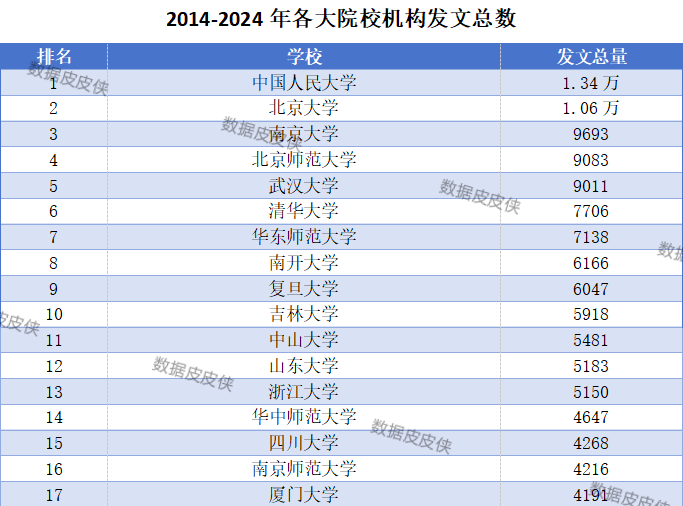 从榜单中可以看到,中国人民大学以1.34万的发文总量傲视群雄,这不仅体现了该校在社会科学领域的深厚底蕴,也彰显了其在学术研究上的持续投入和卓越成果。在过去的十年中,中国人民大学在CSSCI期刊上的发文数量一直稳居第一,这无疑为该校的学术声誉和影响力增添了浓墨重彩的一笔。