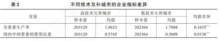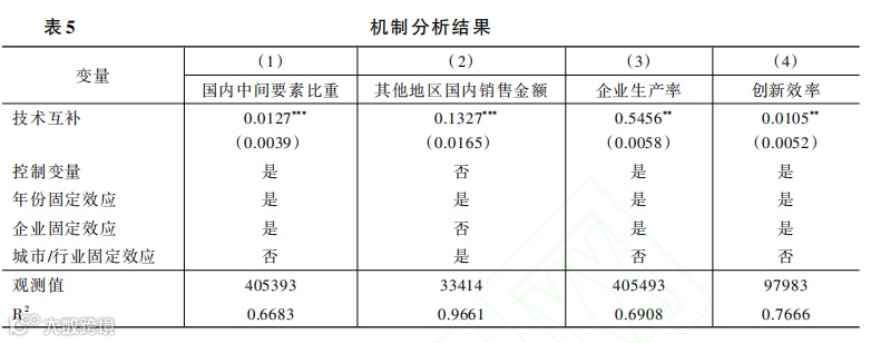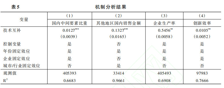 机制描述:技术互补通过增加企业可使用的外部公共技术知识,并通过采用其他地区的新技术和新设备提升生产率。更多的上游中间产品与本地产业形成互补,增加了企业对国内中间产品的使用比重,从而提高了出口国内附加值率。