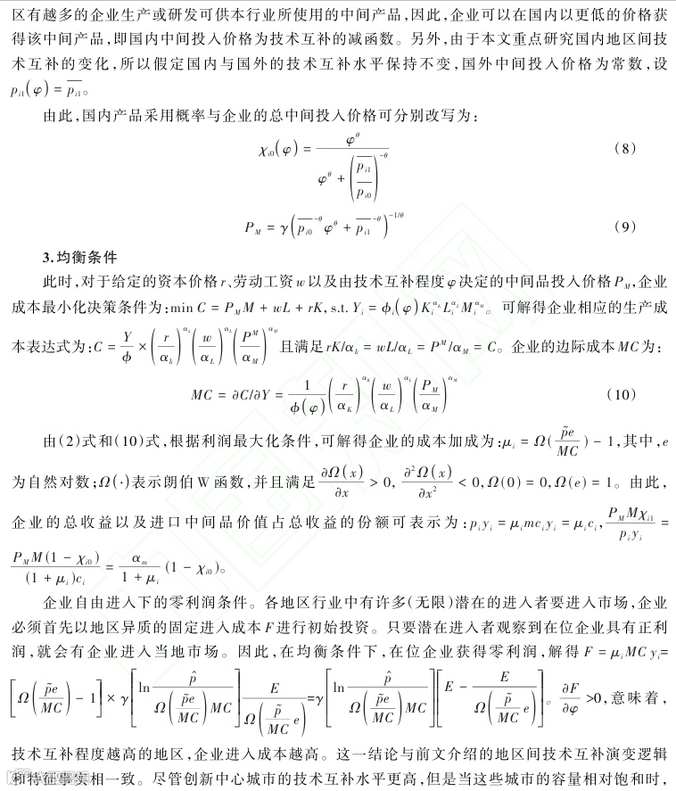 企业的生产率由ϕi(φ)表示,取决于企业创新水平,即其投入生产的发明技术。这些技术可以通过企业内部研发产生,也可以从企业外部获得。企业本地该行业与其他地区该行业的术互补程度φ越高,意味其他地区拥有更多可供该地区行业企业所使用的行业内相近技术、关键生产设备,企业可以利用这些与本企业相配套互补的外部公共知识提高自身生产率。进一步地,由于不同企业所在地区的技术互补程度不同引致的企业生产率差异,使得高生产率企业使用相同的中间投入数量可以生产出更多的最终产品,所以企业的边际成本是生产率和技术互补程度的减函数。不失一般性,令ϕi (Ψ) = Aieφ。