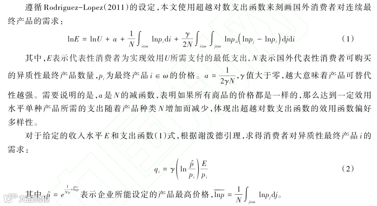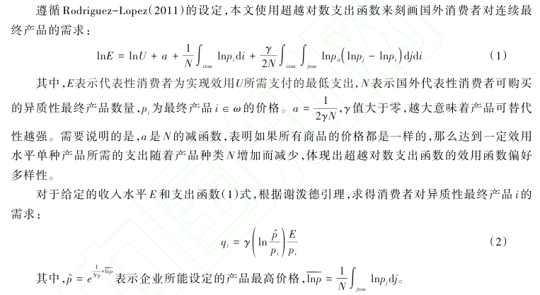 1.最终需求:使用超越对数支出函数来刻画国外消费者对连续最终产品的需求,公式如下: