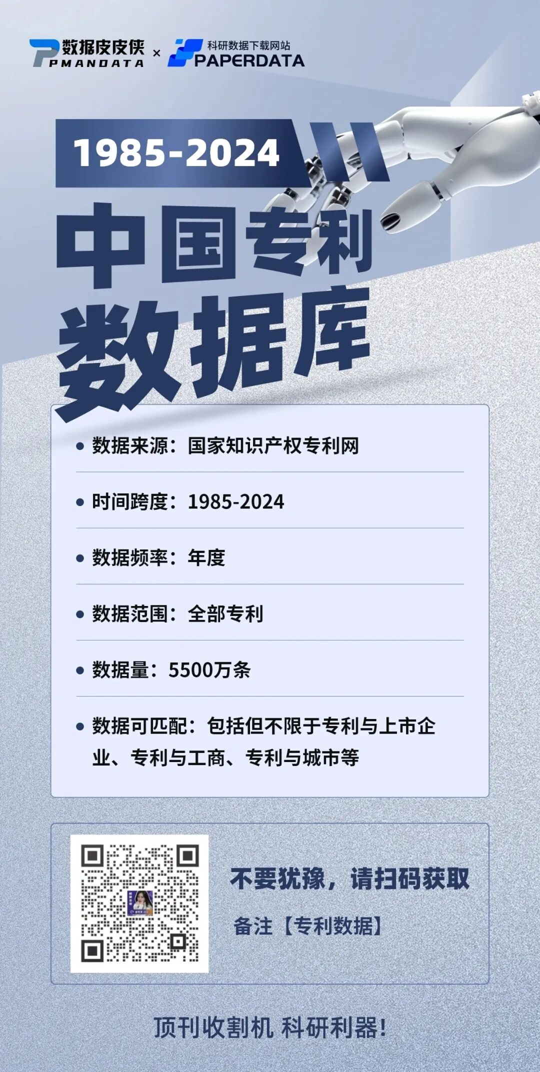 3.国家知识产权局专利数据库:包含1985年以来的专利申请详细信息,如申请日期、申请人、地址、专利名称和专利类型。本文利用该数据库构造了技术互补指数。