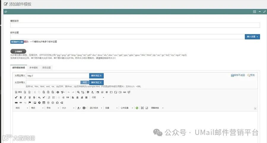 U-Mail邮件营销平台提供现成的所见即所得式编辑器供用户使用,可以进行文字复制、图片插入、排版等操作。