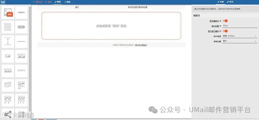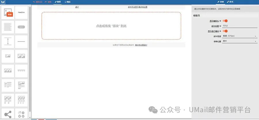 U-Mail邮件营销平台提供的拖拽式编辑器只需要简单拖拽控件就能进行排版,然后修改图片、文字、链接等内容就可以轻松设计邮件模板。设计出来的邮件模板能够自动适应PC端和移动端。