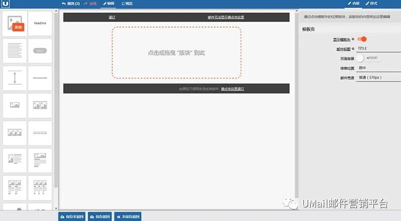 邮件群发中每封邮件差异越大,发送效果越好,U-Mail邮件营销平台一个群发任务支持多个邮件模板,如何轻松的大量设计精美邮件模板呢?U-Mail的拖拽式邮件模板功能使得设计专业的邮件变得简单。您可以直接拖拽不同控件进行布局,然后修改控件中的文字、图片、字体样式等。