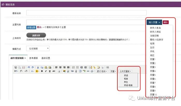 U-Mail邮件营销平台包含丰富变量功能,包括9个常规变量、15个自定义变量以及众多公共变量,以实现内容个性化。同时也可以直接调用API接口,实现与其他系统对接发送。
