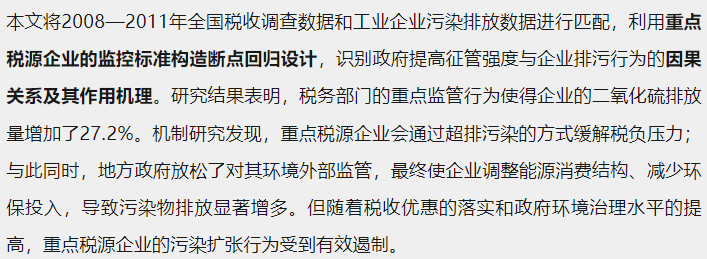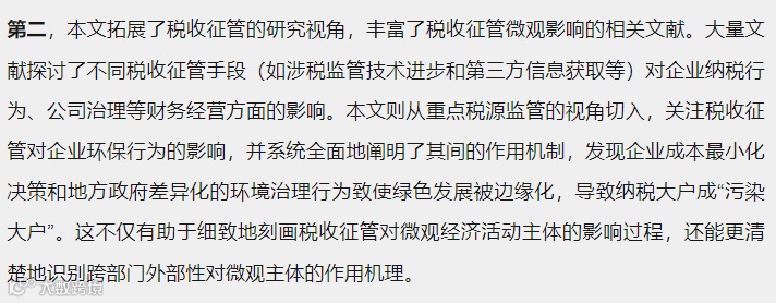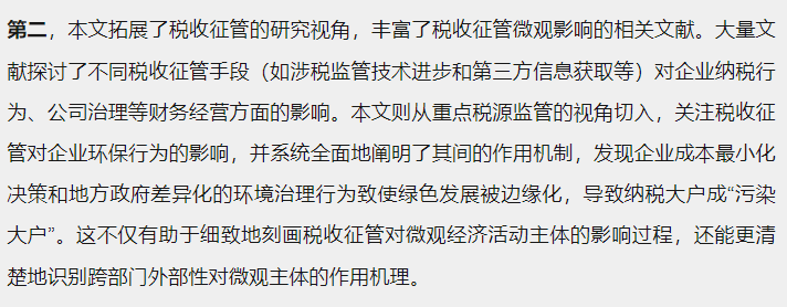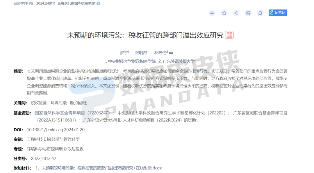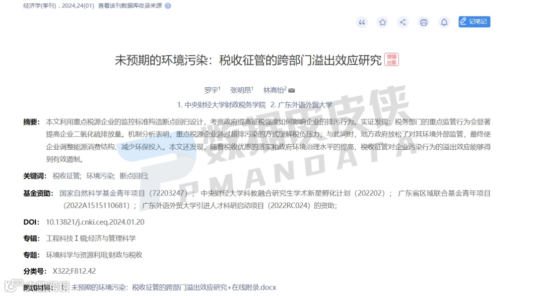 中央财经大学财政税务学院博士研究生罗宇、中央财经大学财政税务学院张明昂、广东外语外贸大学经济贸易学院林高怡合作论文《未预期的环境污染:税收征管的跨部门溢出效应研究》在经济学季刊上正式发表。
