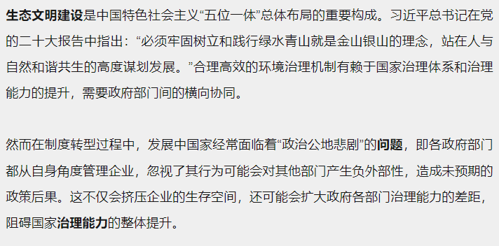本文的研究贡献在以下方面。第一,本文发现税务部门加强征管会带来意外的环境污染问题,丰富了关于政府部门横向间的政策外溢效应研究。大量研究表明,不同政府部门间的政策执行和监管行为可能会在其他领域造成非预期的社会成本,但少有文献关注到环境领域。此外,现有研究大多基于财政分权、政治激励和环境属地管理等视角探讨了如何破解我国环境“运动式治理”困境,尚未对于跨政府部门的协调治理问题予以足够重视。本文的研究表明,当国家治理能力的各维度之间存在明显差异时,极易出现“政治公地悲剧”问题。因此中央在制定相应的政策目标后,应考虑加强政府部门的横向间合作,从各领域、各维度共同推进国家治理体系和治理能力的现代化,减少政策的执行成本和福利损失。