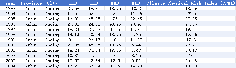 每组CPRI数据包含四个分项指数和一个总指数,涵盖1993年至2023年期间。LTD(极端低温日数)、HTD(极端高温日数)、ERD(极端降雨日数)、EDD(极端干旱日数)是四个子指数,分别代表一个国家/地区一年中极端低温日数、极端高温日数、极端降雨日数和极端干旱日数。这些指数使用下面解释的方法标准化,然后用于构建一般CPRI,它是指一个国家/地区的气候物理风险的总体程度。