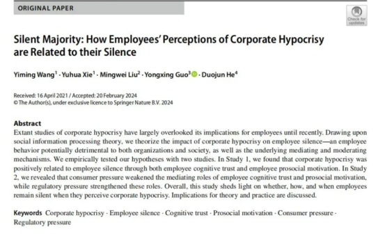 湖南大学工商管理学院博士生王一鸣作为第一作者,在FT50期刊《Journal of Business Ethics》发表学术论文《Silent Majority: How Employees’ Perceptions of Corporate Hypocrisy are Related to their Silence》。王一鸣的博士生导师为湖南大学工商管理学院教授谢玉华,该论文的合作者还有罗格斯大学教授刘明巍、河北工业大学讲师郭永星、中南大学博士生何朵军。