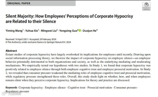 近年来,企业伪善问题日益受到公众和学界的关注。然而,现有的研究多集中于企业伪善对企业形象、消费者信任等方面的影响,而较少关注其对员工行为的影响。社会信息处理理论强调,个体的行为和态度会根据所处环境和情景的不同而进行调整。在企业背景下,这一理论揭示了社会环境信息对员工行为和态度的影响。王一鸣等人在研究中发现,企业伪善作为一种负面的社会环境信息,会显著影响员工的认知信任和亲社会动机,进而导致员工沉默。