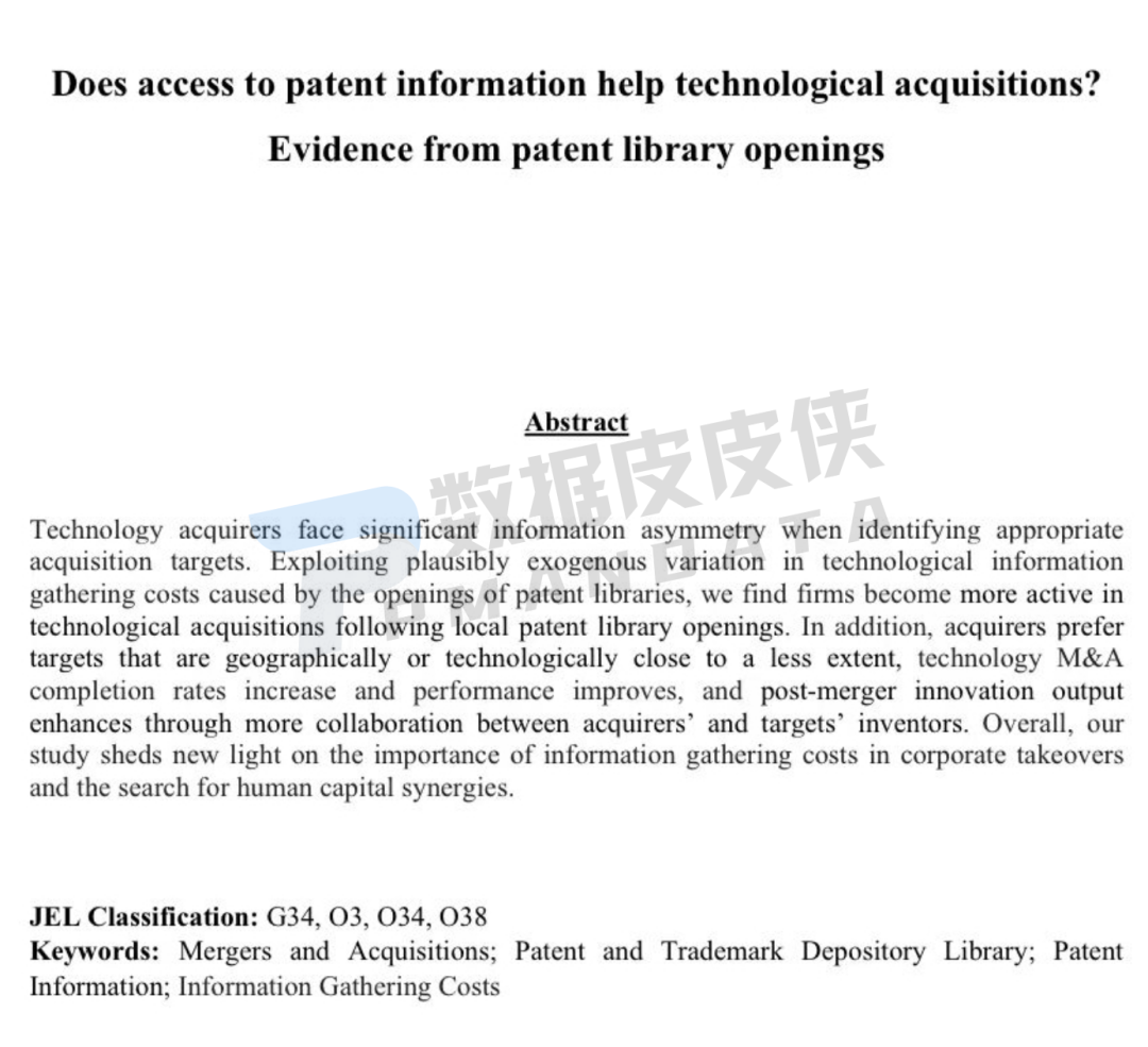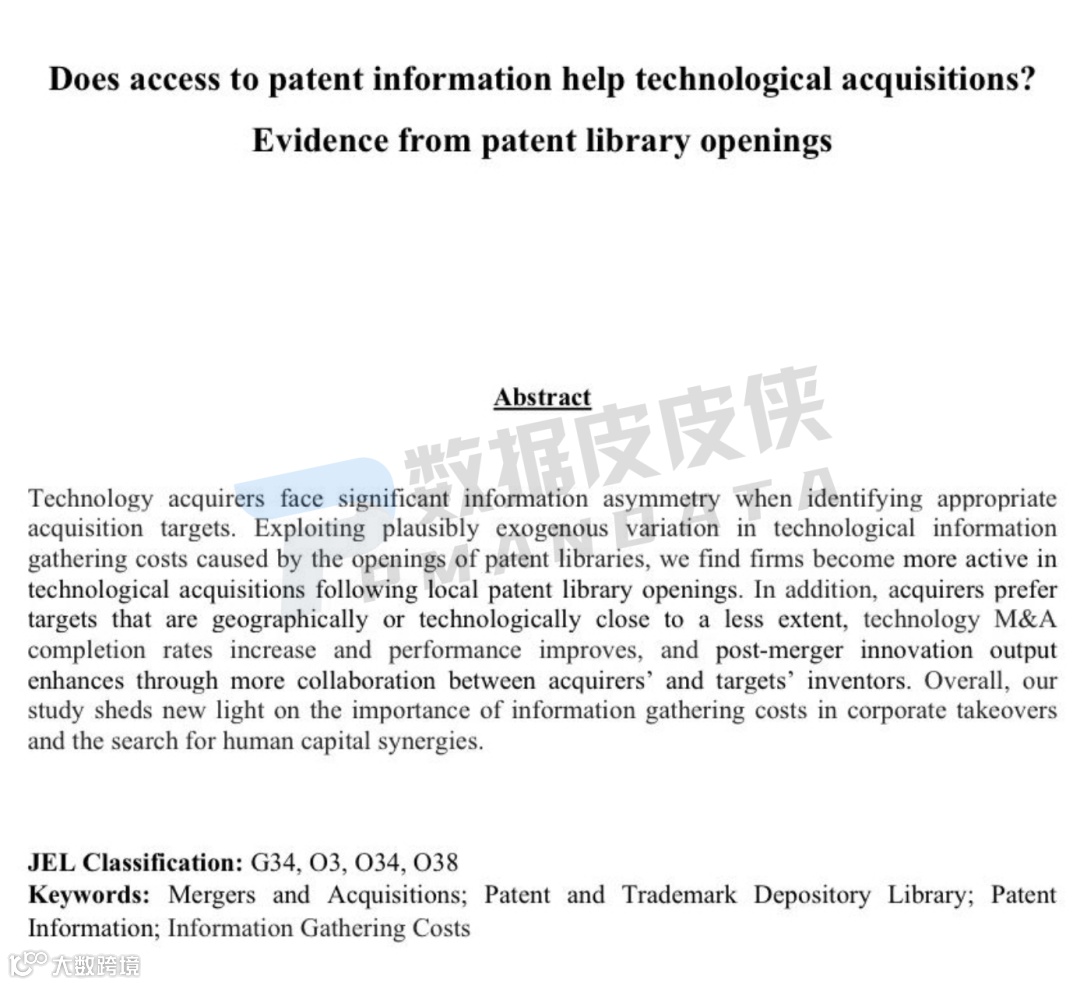 具体地,在这篇论文中,田轩及其团队探索了收购方在选择目标时的选择决策。过往研究认为,由于信息成本较低,收购方倾向于在地理和技术上接近的目标。然而,田轩及其团队的论文研究表明,当地专利库的开放缓解了这一局限性,使收购方能够扩大对潜在目标的搜索范围,超越邻近限制。研究还表明,获得专利信息的机会增加了39.2%的交易完成概率,且合并后公司的7天累计超额收益率提高了1.4%,合并后5年买入并持有收益率提高了10.6%,这意味着并购前获取专利信息,会导致参与交易企业价值的双提升,对收购方和被收购方都有利。此外,研究还强调了信息收集成本在企业收购中的重要性。由于当地专利库的开放,收购者能够与并购目标公司进行更广泛的合作,这种合作能够有效促进企业创新。因此,专利库的开放,对于合并后新公司的创新产出,产生显著的积极影响。
