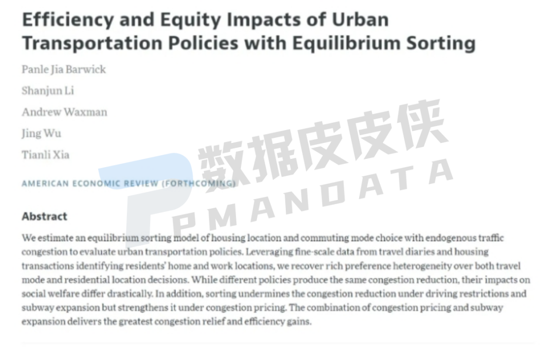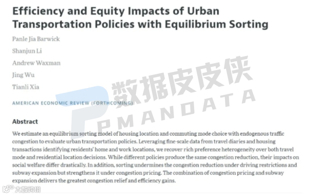近期,清华大学建设管理系教授吴璟联合威斯康星大学麦迪逊分校的贾攀乐、康奈尔大学的李善军、德克萨斯大学奥斯汀分校的Andrew R. Waxman以及威斯康星大学麦迪逊分校的夏天立合作发表名为“Efficiency and Equity Impacts of Urban Transportation Policies with Equilibrium Sorting”的论文被国际经济学顶刊《American Economic Review》正式接收。