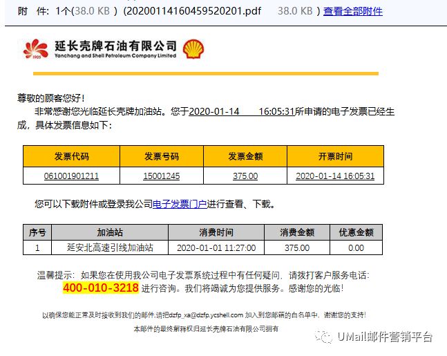 前不久,陕西延长壳牌石油有限公司便和U-Mail邮件群发平台达成合作意向,陕西延长壳牌利用U-Mail邮件群发平台稳定高效的邮件营销服务给客户群发电子发票,如下图所示: