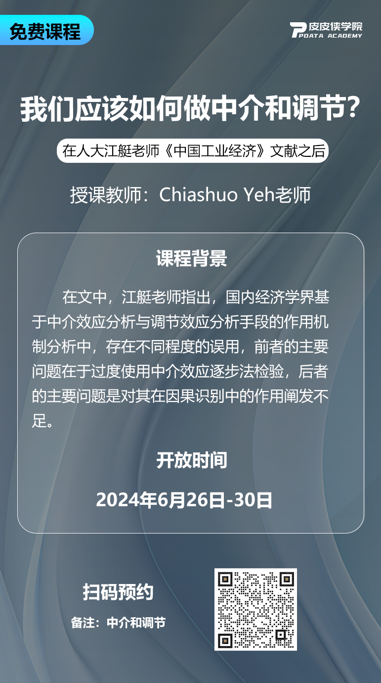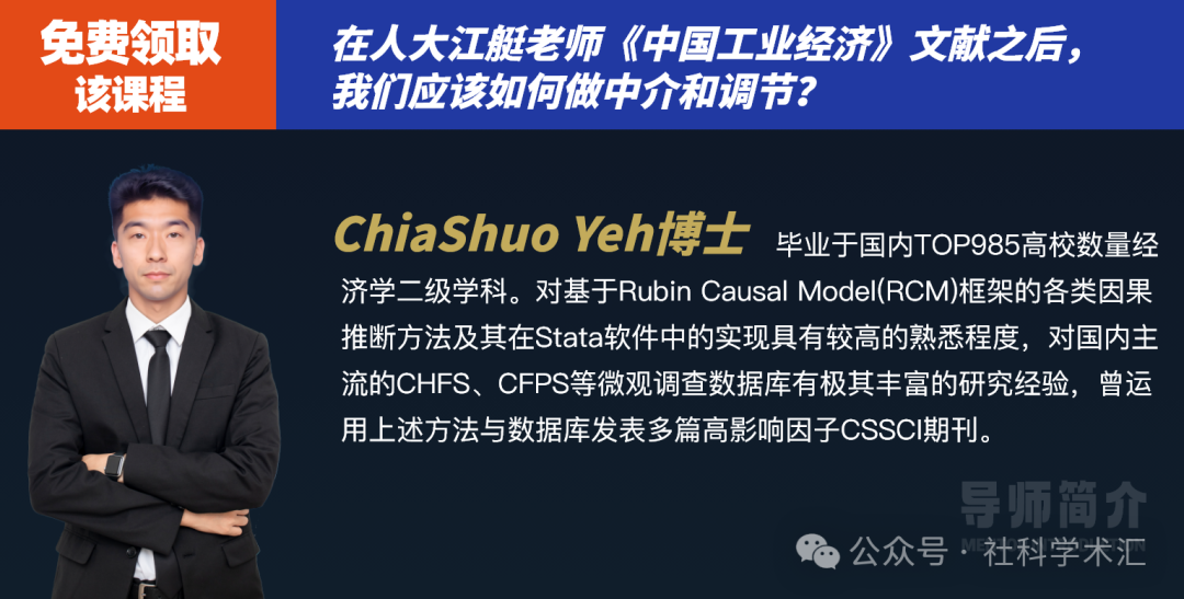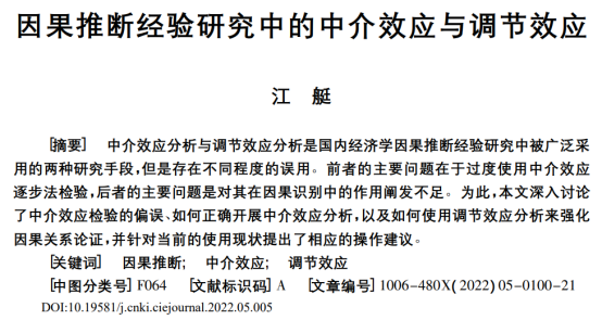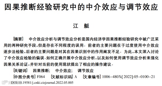 江艇.因果推断经验研究中的中介效应与调节效应[J].中国工业经济,2022(05):100-120.