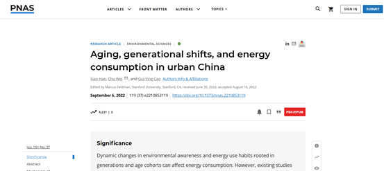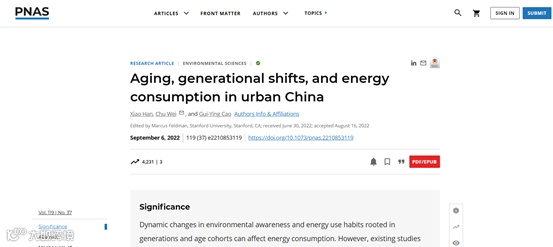 中国人民大学应用经济学院魏楚教授团队与国际应用系统分析研究所(IIASA)学者合作的最新研究成果《Aging, generational shifts, and energy consumption in urban China》成功在国际顶尖学术期刊《美国科学院院刊》(PNAS)上发表。该研究论文聚焦于中国城市化进程中的人口老龄化与代际变迁对能源消费的影响,由应用经济学院博士研究生韩晓担任第一作者,魏楚教授担任通讯作者,中国人民大学作为第一通讯单位,标志着该校在社会科学领域的又一重要突破。