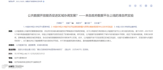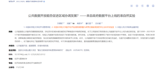 由中国科学院大学经济与管理学院硕士研究生方锦程(第一作者)、中国科学大学经济与管理学院刘颖副教授(通讯作者)、中国人民大学财政金融学院高昊宇教授、中国科学院大学经济与管理学院董纪昌教授、吕本富教授合作的研究成果《公共数据开放能否促进区域协调发展?——来自政府数据平台上线的准自然实验》在《管理世界》上发表。