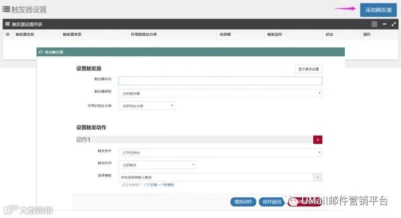 在U-Mail邮件营销平台后台有一个“触发器”功能,营销人员点击后可以对其功能进行设置,如下图所示: