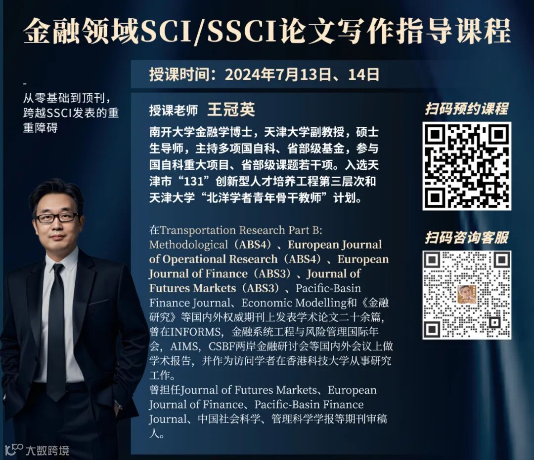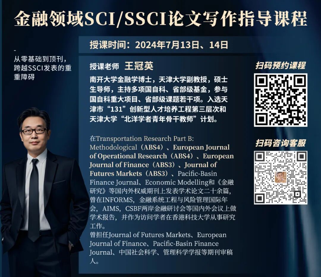 课程目标:从零基础教授到顶刊复现,跨越SSCI发表的重重障碍,帮助大家迅速掌握在金融学领域发表SCI与SSCI期刊的方法技巧; -
