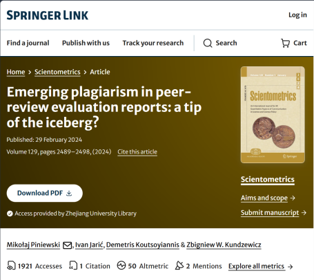 Piniewski, M., Jarić, I., Koutsoyiannis, D. et al. Emerging plagiarism in peer-review evaluation reports: a tip of the iceberg?. Scientometrics 129, 2489–2498 (2024).