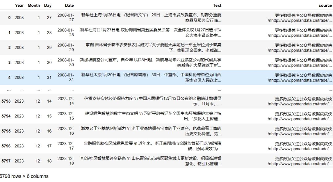 1. 1. 时间跨度:数据从2008年1月27日到2023年12月18日,这大约是16年的时间跨度。这意味着我们有机会观察到超过一个十年期间的经济新闻发展和变化,这对于研究经济周期、政策变化以及重大经济事件的影响等具有重要价值。