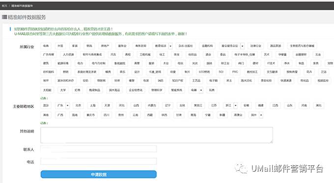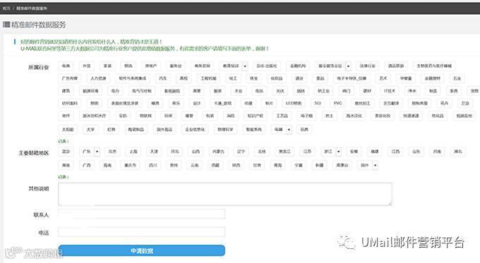 使用U-Mail邮件营销平台的公司,营销人员可以选择“所属行业”、“目标地区”等指标多层筛选,找到合适的潜在消费者。阿里等企业的大数据采集面非常广泛,准确度不用多说,而U-Mail邮件营销平台的精准到达、专业高效也得到业界的一致认可,二者强强联手,使营销人员如虎添翼,仿佛戴上了“千里眼”,一眼就发现人海中的TA,又像长臂罗汉,把TA揪出来,送到你面前。值得注意的是,这些数据并非来自于客户,而是同U-Mail合作的大数据公司所提供!等于是新增的潜在消费者群落!