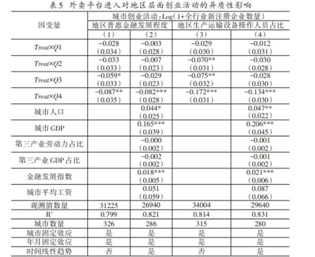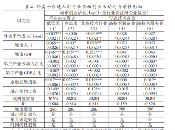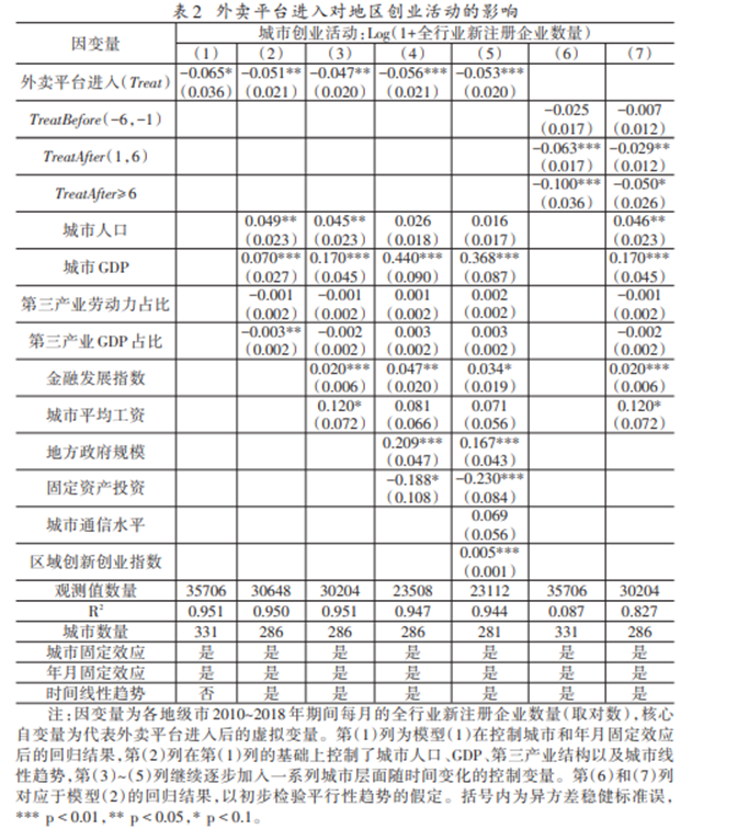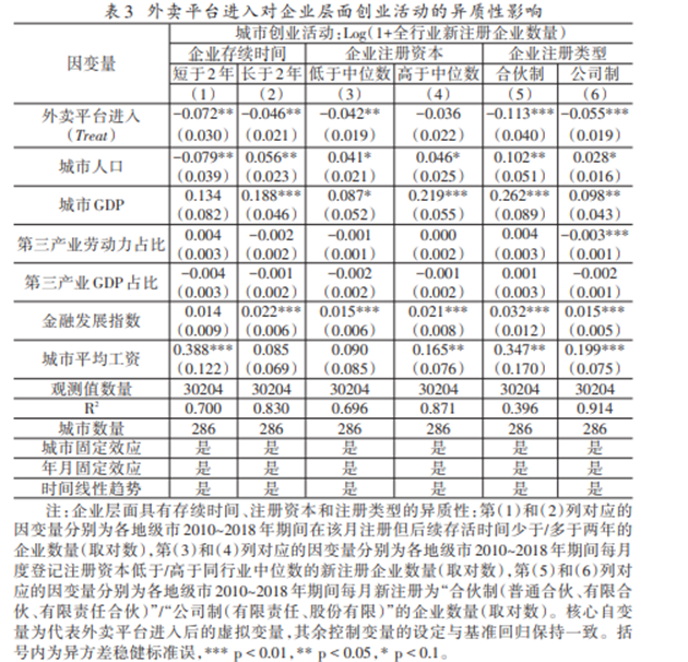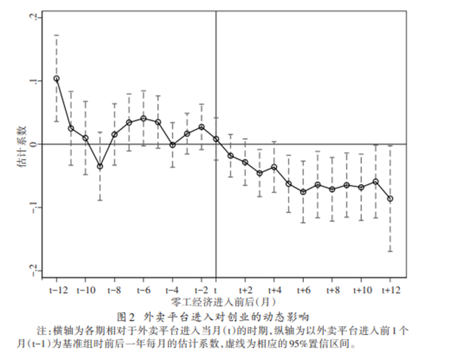 文章使用城市层面的企业注册数量度量创业活动。研究结果表明:对全部样本的估计表明,外卖平台的进入平均而言减少了约4.7%的创业活动;企业和行业层面的异质性分析显示,外卖平台所挤出的主要是低质量、生存型创业活动。与此同时,金融业、信息技术和科研行业的新创企业数目大幅上升,而与零工管理密切相关的人力资源行业的新增企业数目增幅最大。此外,地区层面的异质性分析显示,当融资受到严重约束时,零工经济可能通过提供额外的收入保障体现了促进创业的正效应。在与外卖行业紧密相关的运输业劳动力资源丰富的地区,零工经济对创业活动的负面影响更大,这体现了零工经济平台为劳动者提供灵活就业机会所带来的替代效应。关于个体工商户的分析则说明,零工经济的兴起可能同时促进了市场的细分化与个体化。