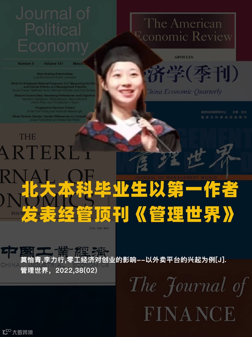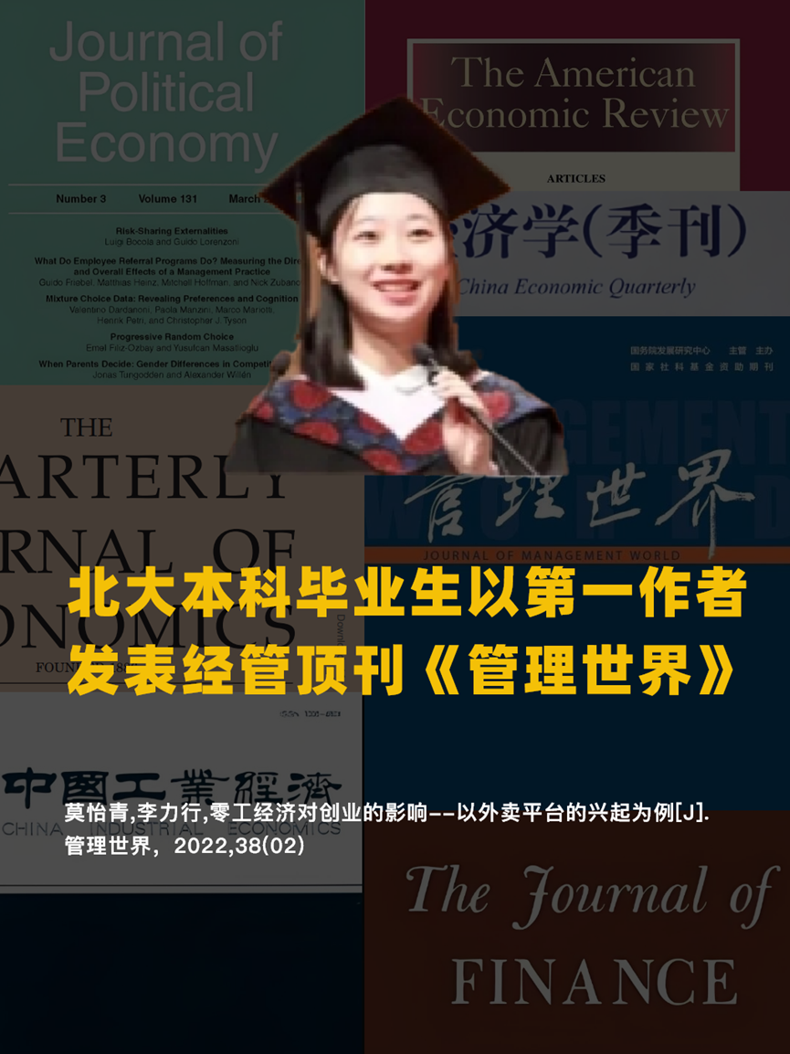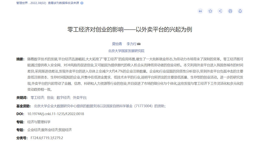 北京大学国家发展研究院2021届本科毕业生莫怡青与北京大学国家发展研究院经济学教授李力行合作的研究成果《零工经济对创业的影响——以外卖平台的兴起为例》在中文顶级期刊《管理世界》上正式发表,这一成果为理解零工经济对创业活动的影响提供了重要的学术贡献。