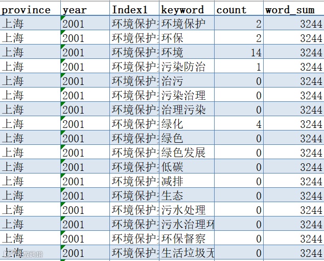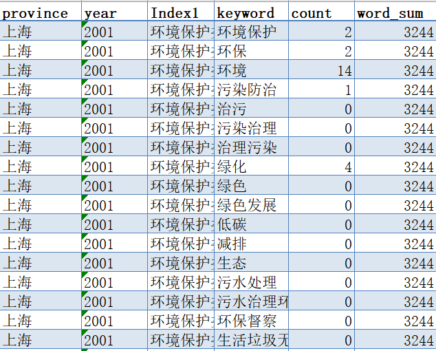 随着经济的发展和工业产业的腾飞,人们更多的从关注经济发展走向可持续生态经济发展,我国也于2020年9月22日在第七十五届联合国大会上提出了碳达峰、碳中和的目标。随着碳市场的建立和逐步完善,越来越多的政策与绿色环保概念相关,这无不彰显着环境治理是我国正积极应对的一个关键问题。通过各省绿色环保词如污染防治、治污、绿化、绿色发展、低碳、减排、生态、污水处理等出现的频率,我们可以大体上看出各地区对绿色发展的关注。同时,对绿色环保词频的研究也具有十分重要的意义,如以绿色词频数来衡量当地政府和企业所制定或面临的环境规制和环境监管等有助于探索当地经济的发展方向。