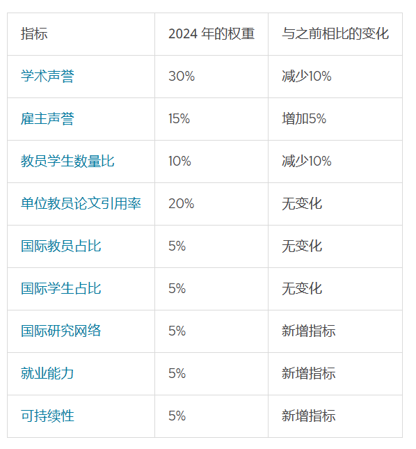 今年的排名方法与去年保持一致。一共有9个维度,也是唯一一个同时将就业能力和可持续发展纳入评价体系的排名