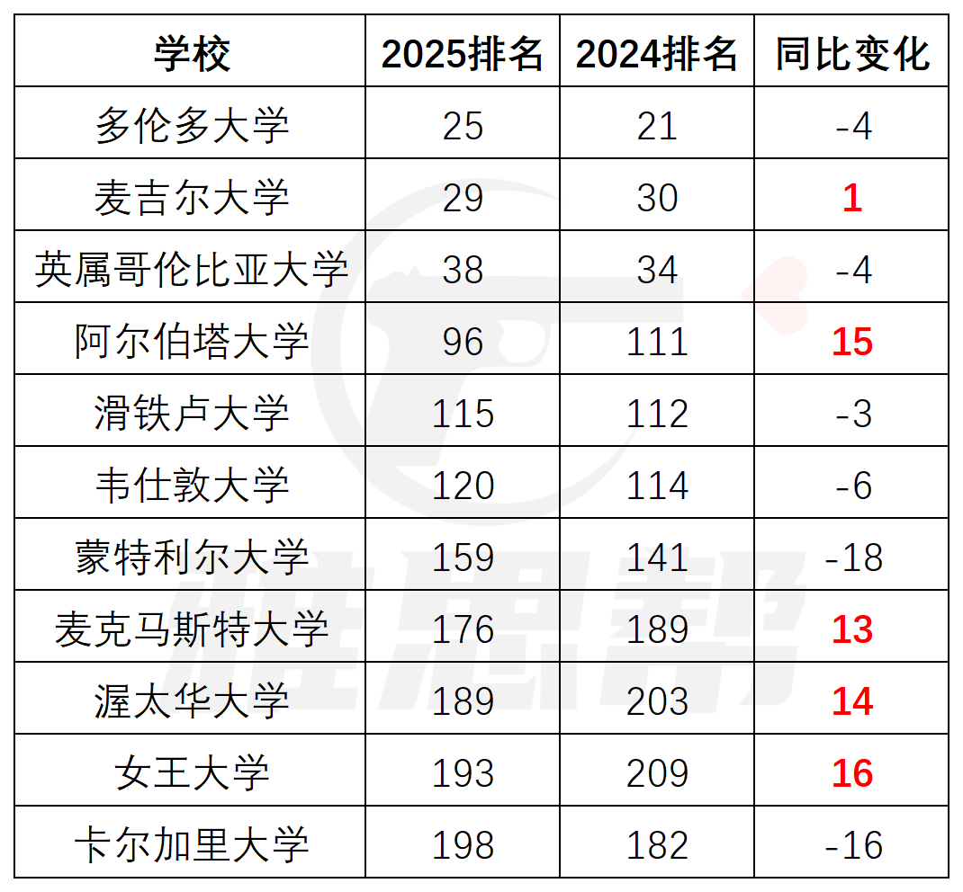 加拿大大学的排名与去年基本相当,阿尔伯塔大学这次冲进了Top100,渥太华大学和女王大学纷纷冲进了Top200