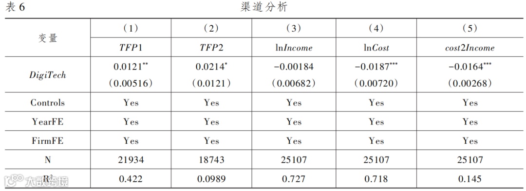 为了检验收入渠道,在表6的第(3)列,本文将总收入的对数(lnIncome)作为因变量。为了检验成本渠道,在表6第(4)列将总成本的对数(lnCost)作为被解释变量。综合成本和收入两个维度,我们在第(5)列加入了成本收入比(cost2Income=总成本/总收入)作为被解释变量。表6显示,企业进行数字化转型后,TFP以及总成本分别显著提高和降低,这印证了效率渠道和成本渠道。但同时,总收入并未显著增加,这说明收入渠道未被证实。同时,表6的第(5)列显示每单位的收入所需的成本下降了,这说明成本收入比下降,因此总体上数字技术的使用提高了企业的财务绩效。
