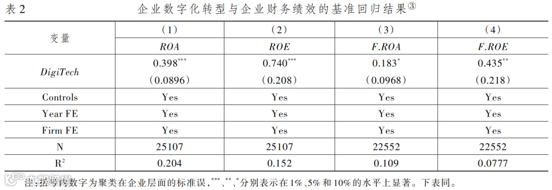表2提供了基准回归的结果,其中核心解释变量为企业数字化转型哑变量(DigiTech)。从中可以看出,无论因变量是ROA还是ROE,关键解释变量的系数都在1%的水平上显著为正。这意味着,当使用基于ERNIE模型构造的新指标后,企业数字化转型显著地改善了企业的财务绩效。然而,上述基准回归可能存在反向因果关系,即财务绩效好的企业现金流充足,更有能力使用数字技术。为了缓解反向因果关系,在表2第(3)和第(4)列,我们将全部因变量提前一期,发现企业数字化转型的系数依然显著为正。这初步证明,企业数字化转型总体上提高了企业的财务绩效,即数字化转型总体上是成功的。这符合经济学逻辑,并且与部分已有文献(杨德明和刘泳文,2018;何帆和刘红霞,2019;赵宸宇等,2021)的发现是一致的。