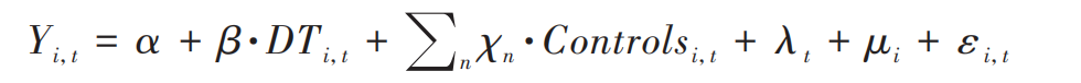 其中因变量Yi,t表示第t年企业i的财务绩效,用ROA(总资产收益率)和ROE(净资产收益率)度量;关键解释变量DT是一组度量企业数字化转型的哑变量,包括是否进行了企业数字化转型(Digi-Tech,即企业是否使用了任何一种数字技术),以及是否使用了六种新型数字技术(大数据、人工智能、移动互联、云计算、物联网和区块链)中的一种。Controls代表一系列控制变量。参考已有文献的做法(杨德明和刘泳文,2018;赵宸宇等,2021;DeStefanoetal.,2018),我们在回归方程中控制了企业年龄、企业规模、增长率(以企业营收同比增速度量)、市值账面比、第一大股东持股比例、董事长是否兼任总经理和现金流等变量。λt表示时间固定效应,μi表示企业固定效应,εi,t代表随机扰动项。本文使用的是企业层面的聚类标准误。