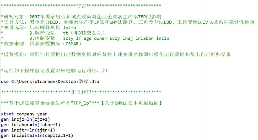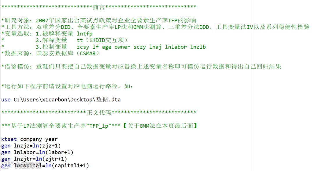 在研究数字经济对企业全要素生产率的影响关系时,使用stata计算了各个企业的全要素生产率,分别使用了LP法和GMM法。并利用计算出来的企业全要素生产率数据进行了实证分析。整理了一下用到的stata代码,分享给大家哦。